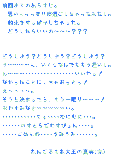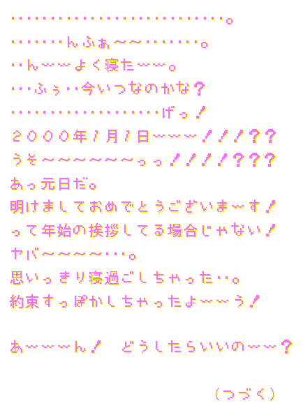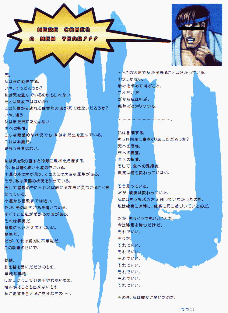 ◆解説◆ 今回の年賀状の狙いは、 1枚目の(つづく)部分で「ここで終わり?」、「ひょっとして来年に続くの?」 2枚目で「年賀状2枚組!?」 と思ってもらうことでした。(笑) ボツネタを読んだら分かると思いますが、文章部分は正直なんでも良かったです。 ちなみにこのボツネタ(というか試作品)は7月の終わりぐらいに、とりあえずとして書きました。 なぜボツったかと言うと、ネタがバレバレ&時季外れなのと文章が恥ずかしいからです。(笑) で、実際に年賀状を作るときになって、どんな文章にするか考えてて、 「とりあえず正月らしくない、めでたくないやつにしよう。」 と決めたのでした。(ナゼ?) で、思いっきりダークな文章にしたわけです。 あと、できるだけ続きが気になるやつにしようと。(私に文章力がないからダメでしたが) 「本能」、「小屋」、「噛み切る」など伏線を張りすぎましたね。 それ以外としては、 1枚目の「HERE COMES A NEW YEAR!!!」と言ってるのは「ストリートファイター2」のリュウです。 格闘ゲームのキャラです。 ちなみにマンガ版では「竜」ではなく「隆」という漢字です。(ゲームでは「リュウ」) 初代スト2の画像を使ったトコに、こだわりがあります。(笑) 「HERE〜」はゲームで「HERE COMES A NEW CHALLENGER!!!」ってメッセージがあるので、そこから。 2枚目は単に「喪中」と「悶絶中」をかけただけです。(笑) 文章で疲れちゃって手抜き(年賀状ソフトで作りやすい)をしたかったので、こうなりました。(笑) ちょっとブラック過ぎたと反省してます。 あと本当に来年の年賀状に続かせて「去年のあらすじ」ってやろうかとも思いましたがやめました。 こんなトコですね。っていうか解説してどうする? (つづかない) |
