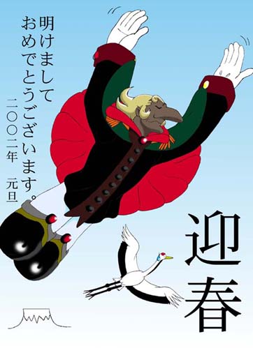 オシャレなレッド公ですが、この演説マント姿は不評のようですね。(^-^;;;;;;) でも、これもだんだん見ているうちにカワイイと思えるようになりまして、年賀状に描いてみました。 よく、お正月に富士山をバックに鶴が二羽飛んでいる感じの絵を見かけますが、 どことなくこの衣装のレッド公が鳥の様に見えたので、 それをイメージして描きました。(^-^;;;;;;;;;;;;;;;;;;;) |