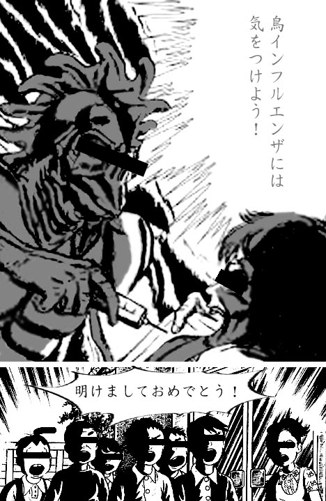 ◆解説◆ 酉年です。 鳥→チキンジョージ(上の部分)→漂流教室(下の部分) という、とても分かりやすい内容となってます。 すごく分かりやすいのですが、念のため説明しておくと、 チキンジョージというのは楳図かずお作『14歳』というマンガに出てきたキャラです。 この『14歳』は、ご存じの通り『漂流教室』の未来の世界がナゼ滅びたのかを描いた作品です。 まあ、誰もが知ってることですが一応説明させていただきました。 なお、公開にあたり人権保護の観点から目隠しを入れさせていただきました。 |